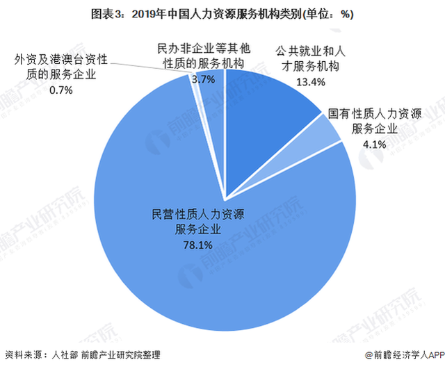 從服務(wù)機構(gòu)類別看,2019年,縣級以上地方政府人力資源社會保障部門(含其他行業(yè)管理部門)共設(shè)立公共就業(yè)和人才服務(wù)機構(gòu)占人力資源服務(wù)機構(gòu)總量的13.4%;國有性質(zhì)人力資源服務(wù)企業(yè)占4.1%;民營性質(zhì)人力資源服務(wù)企業(yè)占78.1%;外資及港澳臺資性質(zhì)的服務(wù)企業(yè)占0.7%;民辦非企業(yè)等其他性質(zhì)的服務(wù)機構(gòu)1470家,占3.7%。
