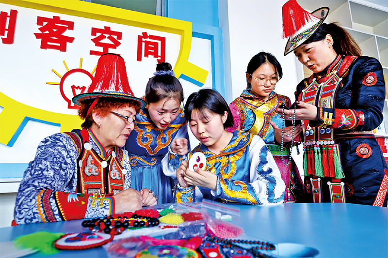 近年來,甘肅省張掖市肅南裕固族自治縣將非遺項目引進課堂,培養(yǎng)高素質(zhì)技能型人才,助推青年就業(yè)創(chuàng)業(yè)。圖為2023年3月21日,國家級非物質(zhì)文化遺產(chǎn)裕固族服飾傳承人(左一)向?qū)W生們傳授裕固族刺繡技藝。 人民圖片 王將/攝