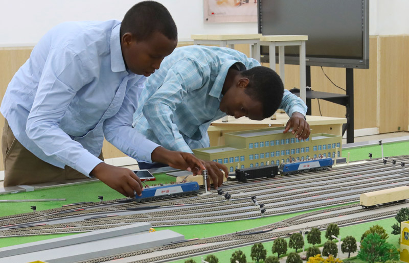 在位于吉布提首都吉布提市的吉布提工商學(xué)校,學(xué)生在魯班工坊鐵道運(yùn)營沙盤教學(xué)區(qū)學(xué)習(xí)(2022年9月19日攝)。新華社記者 董江輝 攝